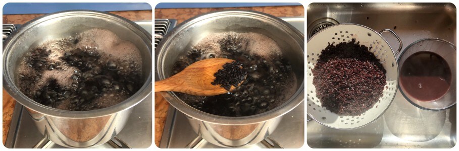 Ich liebe das Aroma von frisch gebackenem Brot, das sich in der Küche verbreitet, wenn der schwarze Reis auf dem Herd kocht. Ich liebe diese Reissorte wegen ihres außergewöhnlichen Geschmacks und ihrer unverwechselbaren Farbe. Sie macht selbst die einfachsten Gerichte einzigartig; stimmt ihr mir zu? Das erste Gericht, das ich euch heute vorstelle, ist ein Beispiel dafür: es ist einfach, aber zugleich besonders. Es handelt sich um Venere Reis mit Kirschtomaten und Mozzarella. Bis hierhin nichts Besonderes. Das, was es originell macht, ist die Sauce, die es begleitet; eine dunkle und samtige Creme, die mit dem Kochwasser des Reises zubereitet wird. Seid ihr nicht neugierig, es auszuprobieren?