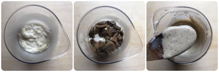 Die Béchamel in den Mixbecher des Stabmixers geben, 50 g gekochte Champignons hinzufügen und pürieren, bis eine glatte, homogene Creme entsteht. Probieren und bei Bedarf mit Salz und Pfeffer abschmecken.