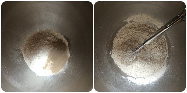 Die beiden Mehle und die Trockenhefe in die Schüssel der Küchenmaschine geben und gut mit einem kleinen Schneebesen vermischen.