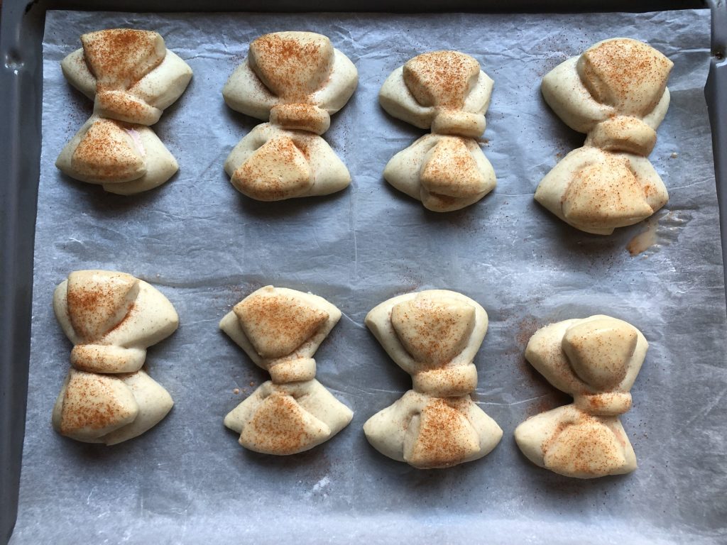 • Nach dieser zweiten Gärung die Oberseite der Schleife mit einer Mischung aus Milch und Paprika bestreichen (Sie können sie nach Belieben dosieren). Zum Schluss, um die Farbe zu verstärken, mit zusätzlichem Paprika bestäuben, der durch ein kleines feinmaschiges Sieb gesiebt wird.