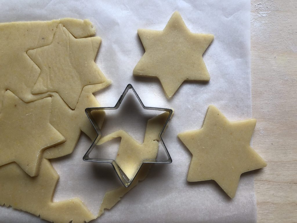 Dann mit dem 7 cm großen sternförmigen Ausstecher 10 große Sterne ausstechen.