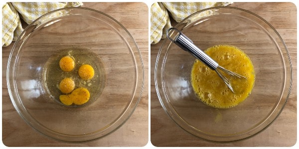 Die Eier in eine große Schüssel schlagen, nach Belieben salzen und pfeffern und mit einem kleinen Handbesen schlagen, bis Eigelb und Eiweiß vermischt sind.