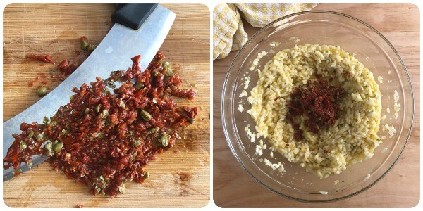 Die getrockneten Tomaten aus dem Öl abtropfen lassen und zusammen mit den Kapern hacken, bevor sie in die Schüssel mit den anderen Zutaten gegeben werden.