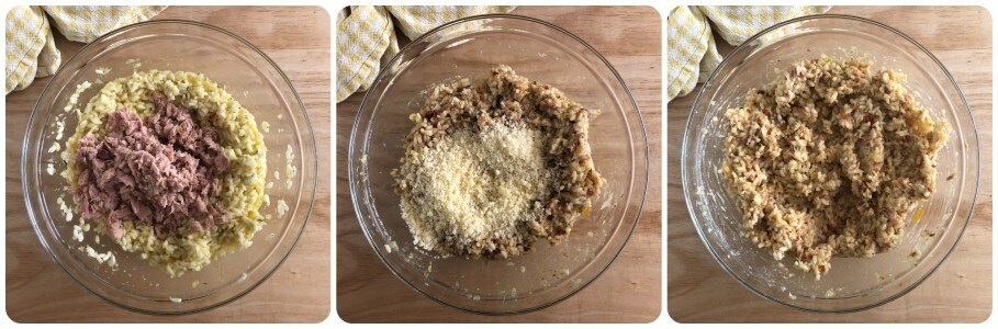 Zum Schluss auch den abgetropften und zerkleinerten Thunfisch sowie den fein gehackten Fontina hinzufügen. Alles sorgfältig vermengen.