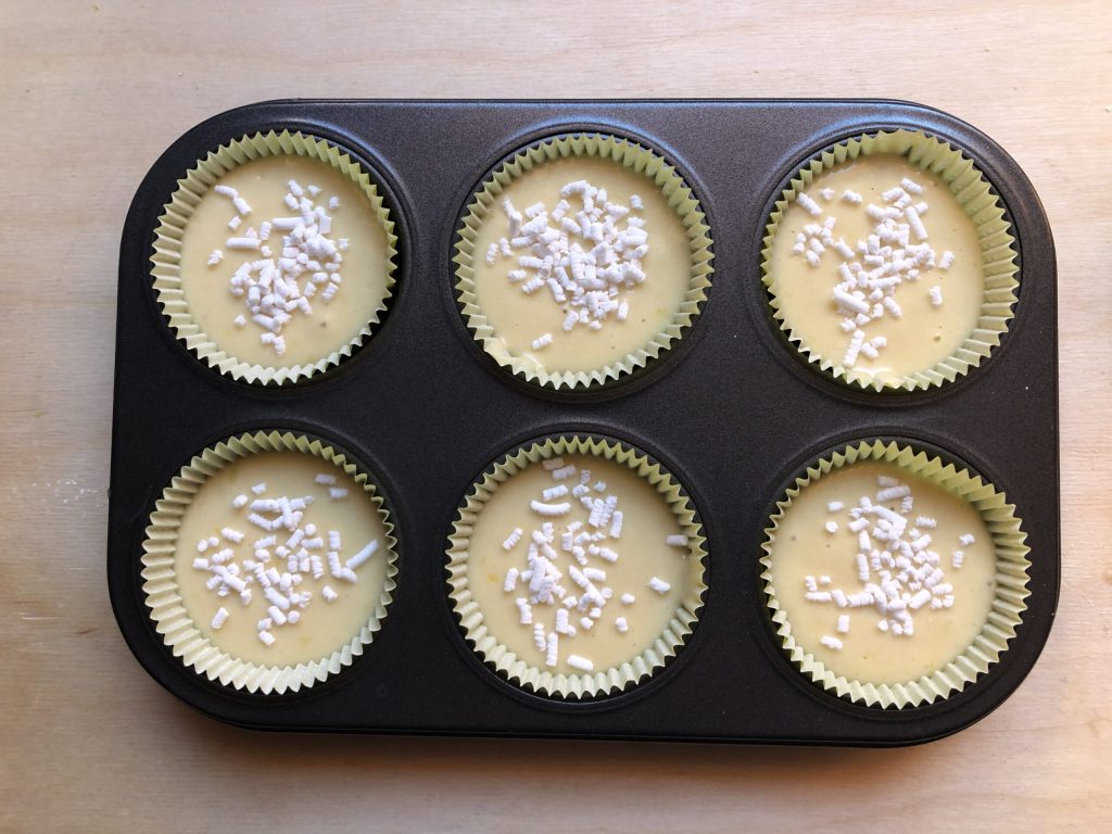 Den Teig in die vorbereiteten Muffinformen füllen, ohne sie ganz zu füllen. Zum Schluss mit Zuckerstreuseln bestreuen.