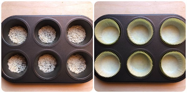 Zuerst die Muffinformen vorbereiten, indem man etwas Reis auf den Boden jeder Vertiefung gibt, bevor man die Papierförmchen hineinlegt. Auf diese Weise hinterlässt der Teig kein Fett und keine Feuchtigkeit auf dem Papier, und der Boden jedes Muffins bleibt sauber. Der Reis ist nicht erforderlich, wenn Sie Silikonförmchen verwenden.