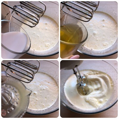 Die Milch, das Öl und den Zitronensaft hinzufügen und den Teig erneut mit den Schneebesen bearbeiten.