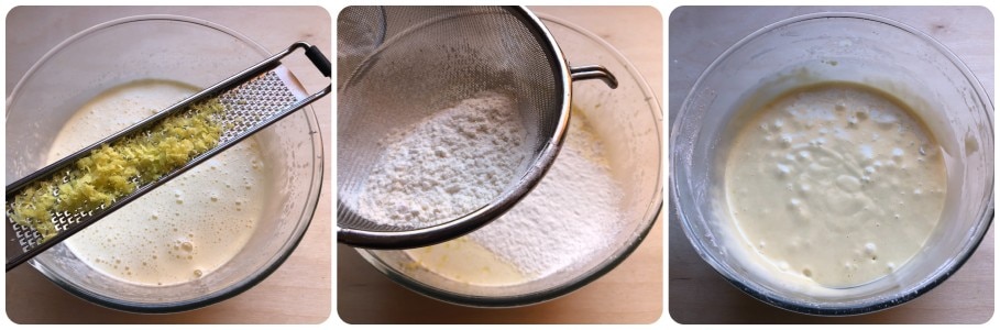 Nun die Zitronenschale hinzufügen und die zuvor vermischten trockenen Zutaten mit einem feinmaschigen Sieb und einem Spatel unterheben.