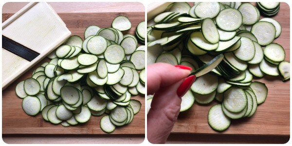 Die Zucchini waschen, die Enden abschneiden und sie mit Küchenpapier trocken tupfen. Dann fein mit einer Mandoline in Scheiben schneiden.
