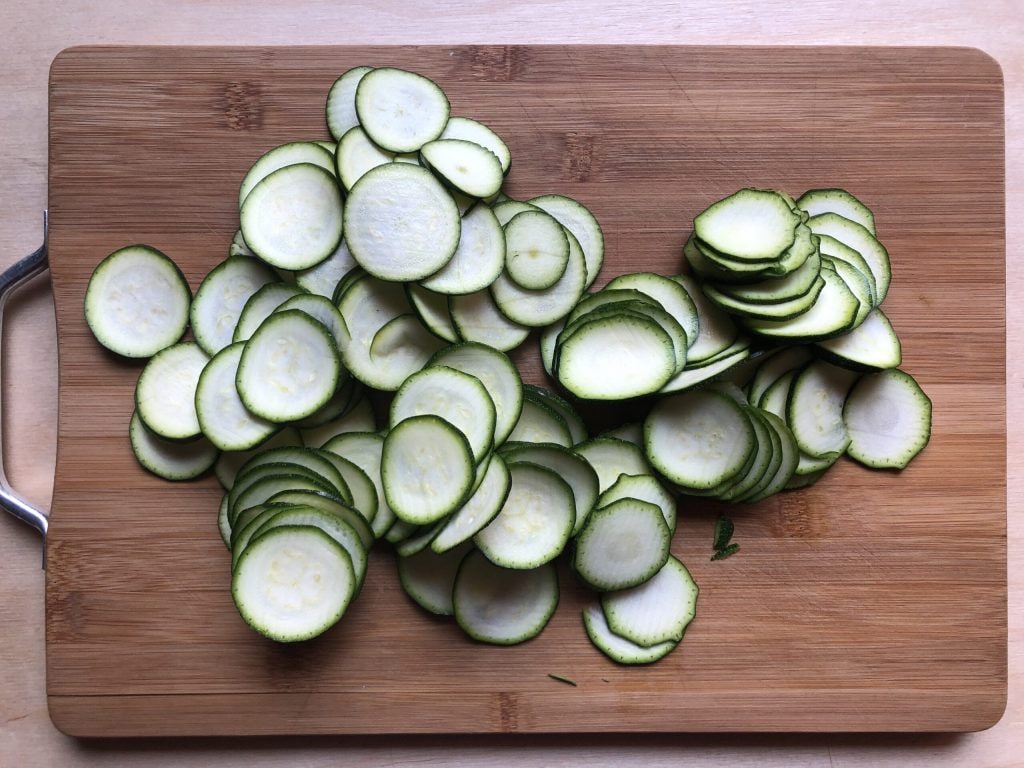 Die Zucchini spitzen, waschen, mit Küchenpapier trocken tupfen und mit einer Mandoline in dünne Scheiben schneiden.