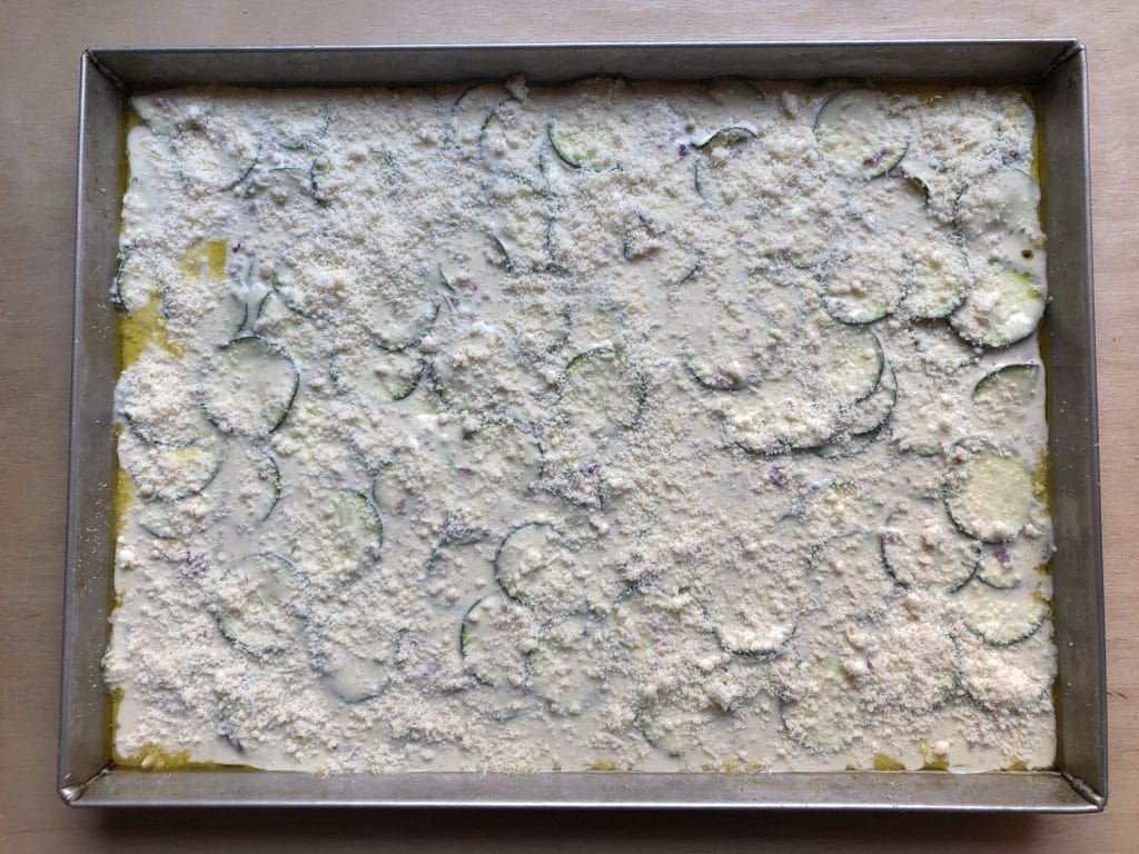 Zum Schluss den restlichen geriebenen Käse über die gesamte Oberfläche des Zucchini-Fladens streuen.