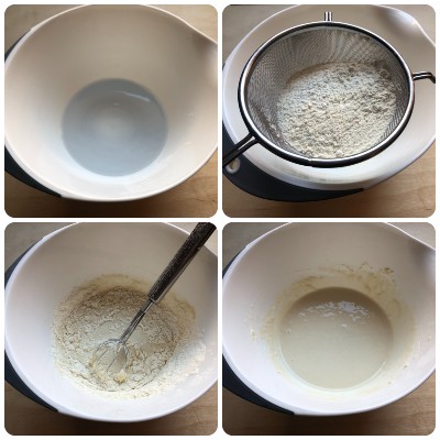 Dann das Mehl durch ein Sieb mit feinen Maschen sieben und kräftig mit einem kleinen Schneebesen mischen (die Menge des Mehls muss ein wenig nach Augenmaß bestimmt werden; man sollte einen relativ cremigen Teig erhalten).