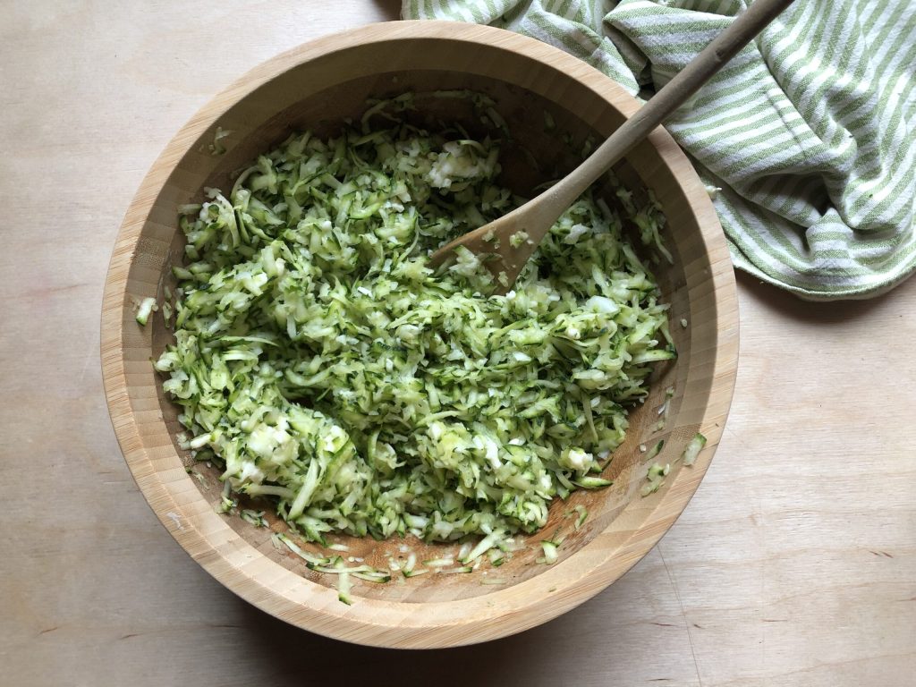 Die Zucchini waschen, abtrocknen und mit einer Reibe mit großen Löchern in Julienne schneiden.