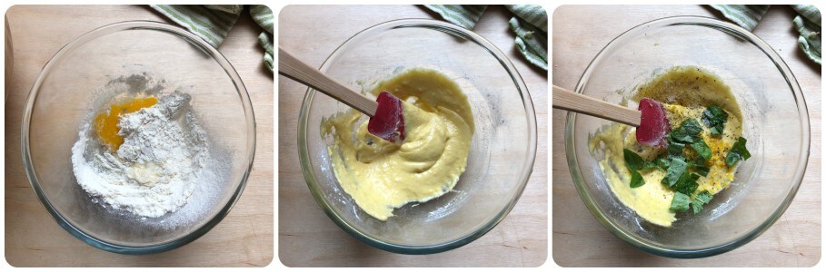 In einer anderen Schüssel (kleiner) das Ei aufschlagen, dann das gesiebte Mehl zusammen mit dem Backpulver, der Schale einer halben Zitrone, den zerkleinerten Basilikumblättern, einer großzügigen Prise Salz und einer großzügigen Prise schwarzen Pfeffer hinzufügen.
