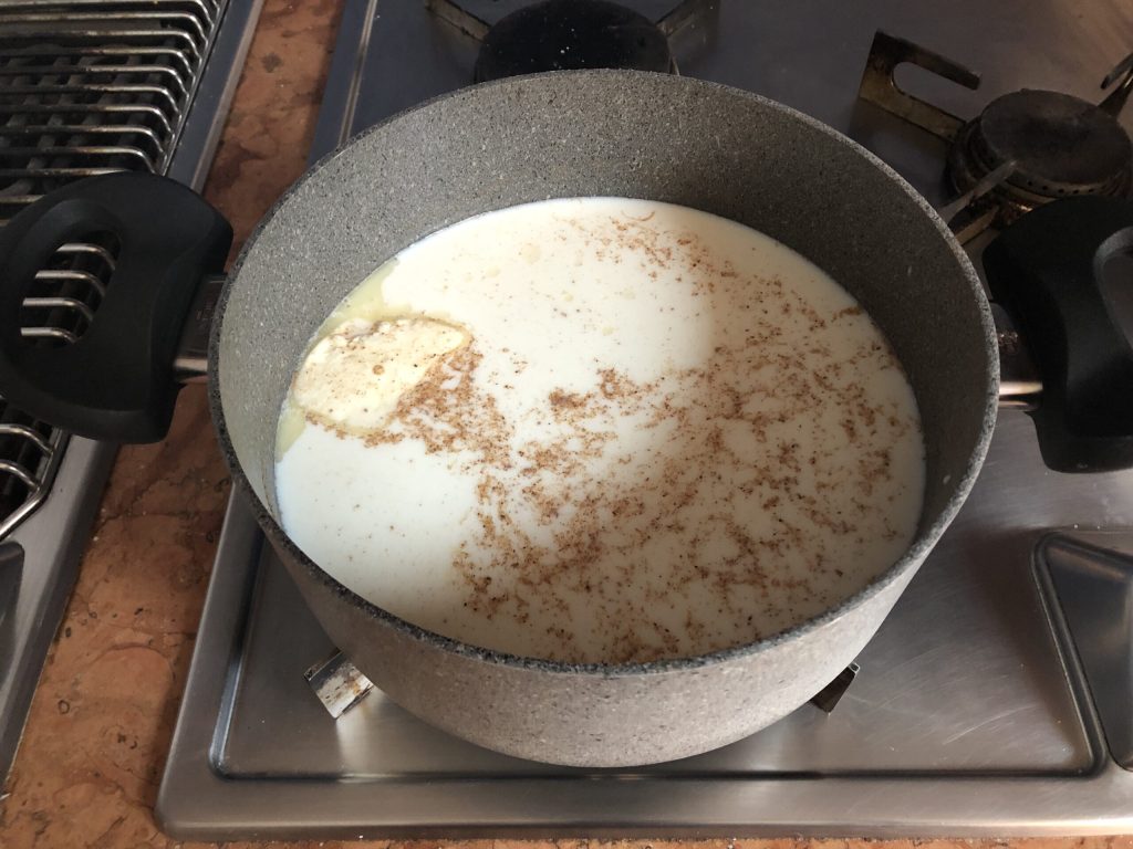 Die Milch in eine Kasserolle gießen, 20 g Butter, eine gute Prise Salz und eine großzügige Prise Muskatnuss hinzufügen, auf den Herd stellen und zum Kochen bringen.