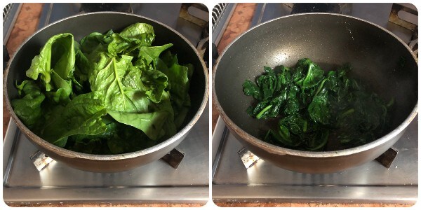 Den Spinat waschen, gut ausdrücken und dann bei starker Hitze in einer kleinen Pfanne mit etwas Öl anbraten, dabei ständig umrühren, bis er zusammengefallen ist (das dauert nur ein paar Minuten). Mit einer Prise Salz würzen und beiseite stellen.