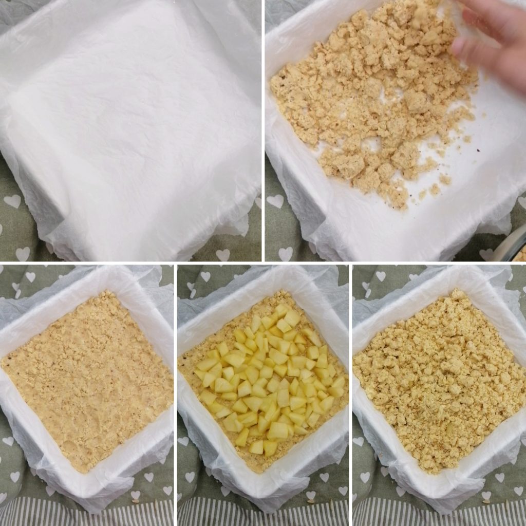 Die Form mit nassem und gut ausgewrungenem Backpapier auslegen, die Streusel des Mürbeteigs darauflegen und den Teig nach unten drücken, die Äpfel darauf verteilen und grob mit dem Teig bedecken.