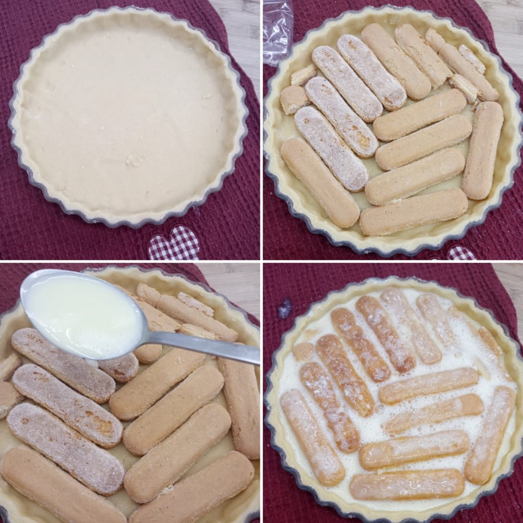 Wenn die Creme lauwarm (nicht heiß) ist, beginne, sie mit einer Kelle auf die Löffelbiskuits zu gießen. Gieße sehr langsam, damit die Löffelbiskuits die Flüssigkeit gut aufsaugen.