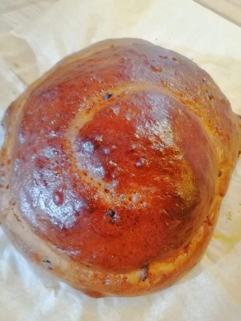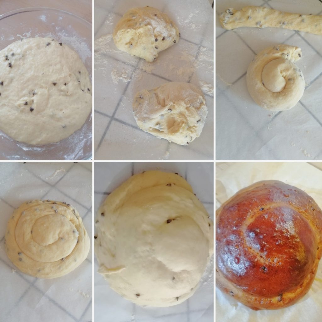 Nach den 4 Stunden den Teig nehmen, auf eine leicht bemehlte Arbeitsfläche legen und in zwei Teile teilen, zu Strängen formen, diese verdrehen und zu einer großen Schnecke formen.