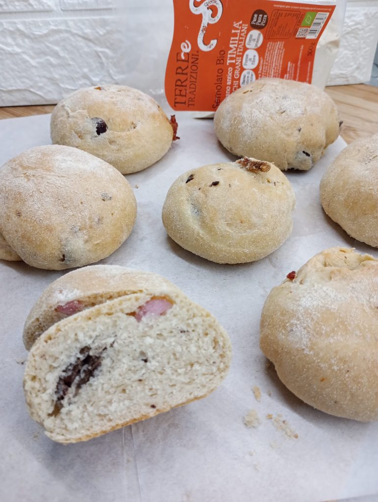 Einmal aus dem Ofen, lasse sie auf einem Gitter vollständig abkühlen. Deine Brötchen mit Oliven und Guanciale sind jetzt bereit, genossen zu werden! Der Duft des gerösteten Guanciale und die Weichheit des Teigs machen sie unwiderstehlich.