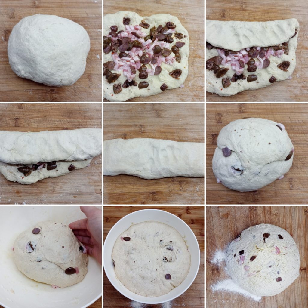 Übertrage ihn dann auf die Arbeitsfläche, rolle ihn zu einem Rechteck aus, um den Guanciale und die Oliven darauf zu legen, rolle ihn auf sich selbst und knete noch einige Minuten, um die Füllung gut zu vermischen.