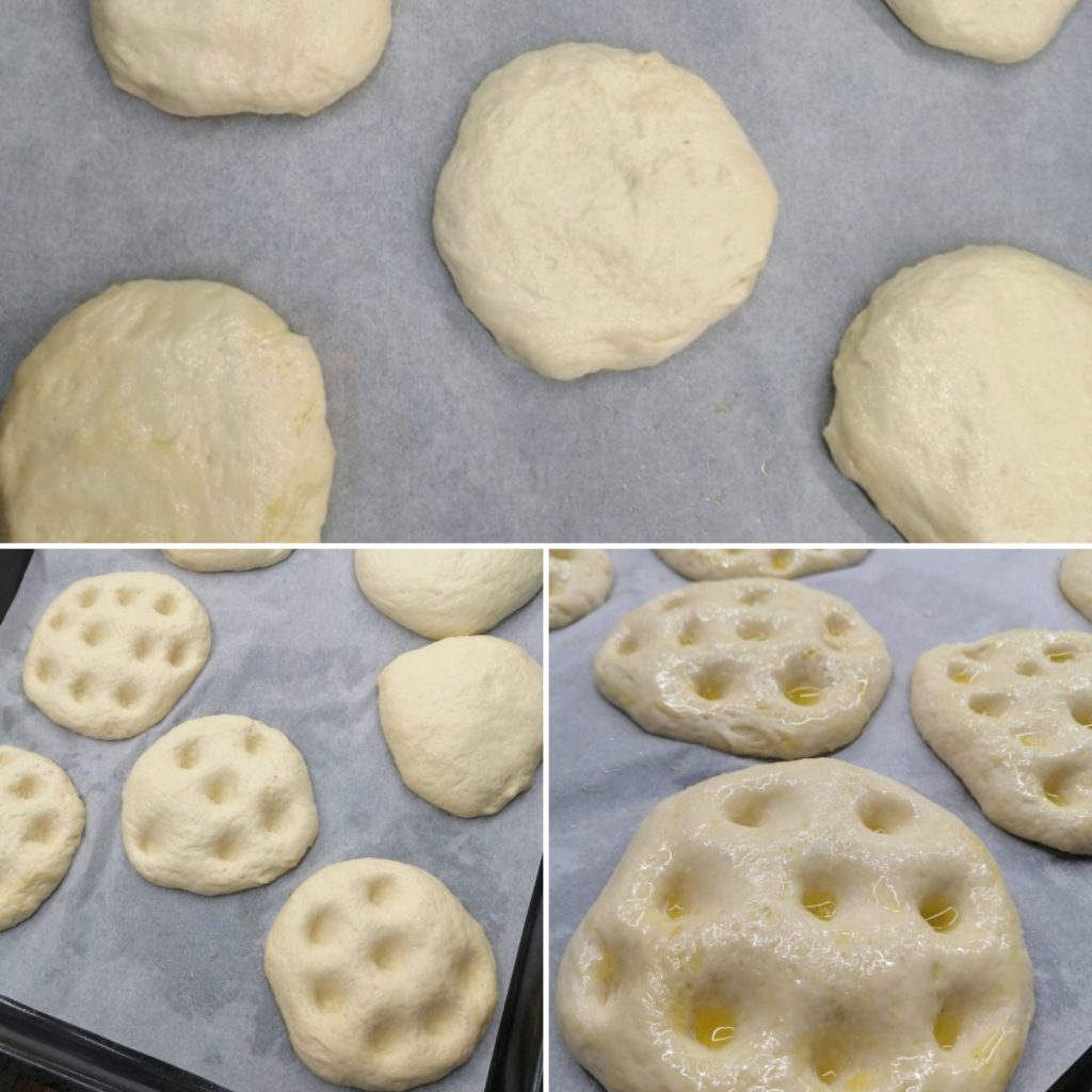 Nach der zweiten Ruhezeit die Oberfläche mit den Fingern eindrücken und mit extra nativem Olivenöl bestreichen. Wenn Sie möchten, können Sie Salzgranulat darauf streuen.