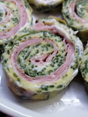 Nach dem Kochen auf ein Blatt Backpapier legen. Während die Frittata noch heiß ist, den Käse verteilen und den Schinken darauflegen, aufrollen.