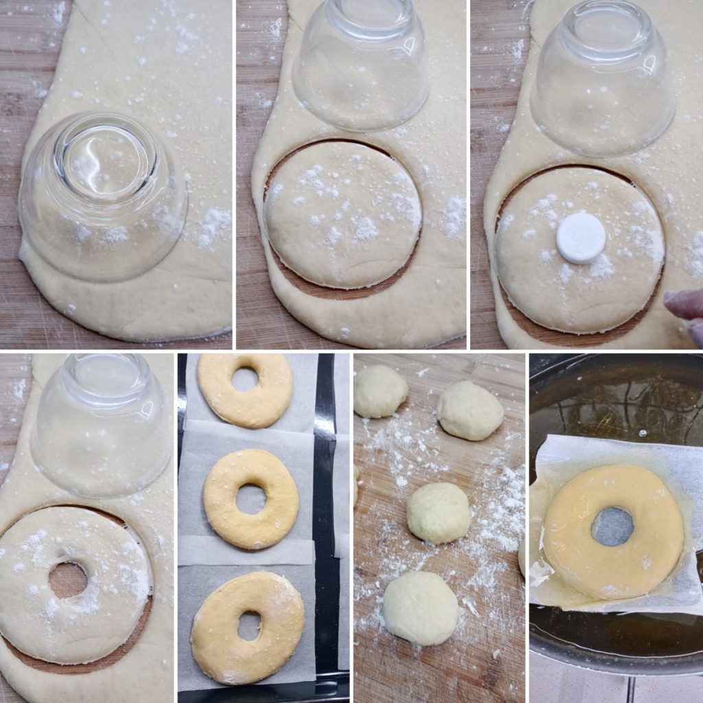 Mit einem Glas, einem Ausstecher oder einer Schale Kreise ausstechen und die Donuts formen, für das Loch in der Mitte habe ich einen bemehlten Flaschenverschluss verwendet.
