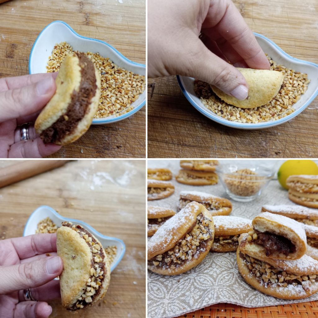 In die Mitte die Haselnusscreme oder Marmelade geben, mit einem Löffel verstreichen und den Keks auf sich selbst klappen.