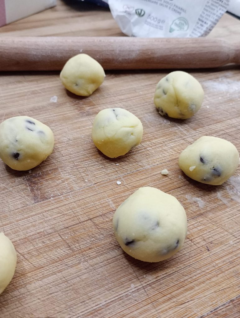 Kleine Stücke vom Teig nehmen und mit den Händen Kugeln formen und auf ein mit Backpapier ausgelegtes Blech legen.