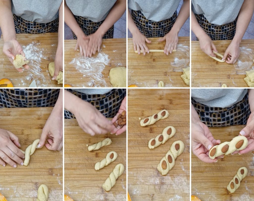 Nach dieser Zeit kleine Stücke Teig von etwa 60 g entnehmen und dünne Stäbchen von etwa 20 cm Länge formen, jeden in der Mitte biegen und um sich selbst wickeln, um die Zopfform zu erhalten, in jeden Zopf die Mandeln einlegen und gut andrücken.