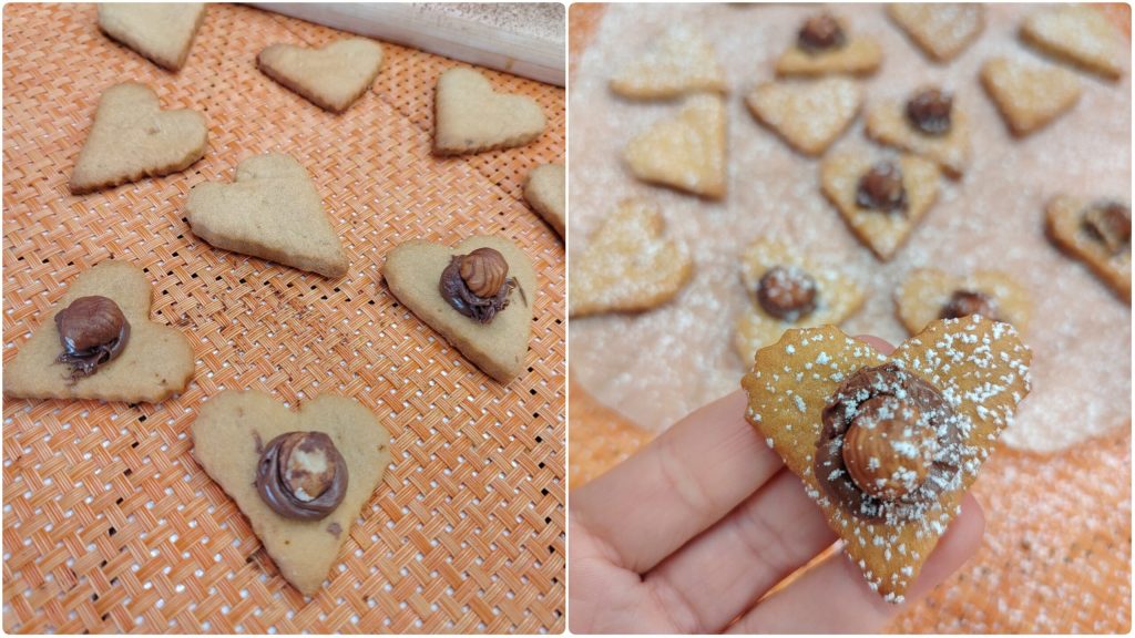 • Die Plätzchen sind fertig zum Genießen, sobald sie vollständig abgekühlt sind. Ihr könnt in die Mitte einen halben Teelöffel Haselnusscreme (oder eine andere Creme eurer Wahl) geben; auch Marmelade oder Konfitüre eignen sich hervorragend. Ich habe nur eine einzelne Haselnuss aufgelegt, aber richtet es nach eurem Geschmack. Ich hoffe, euch hat dieses Rezept gefallen. Bis zum nächsten Mal!