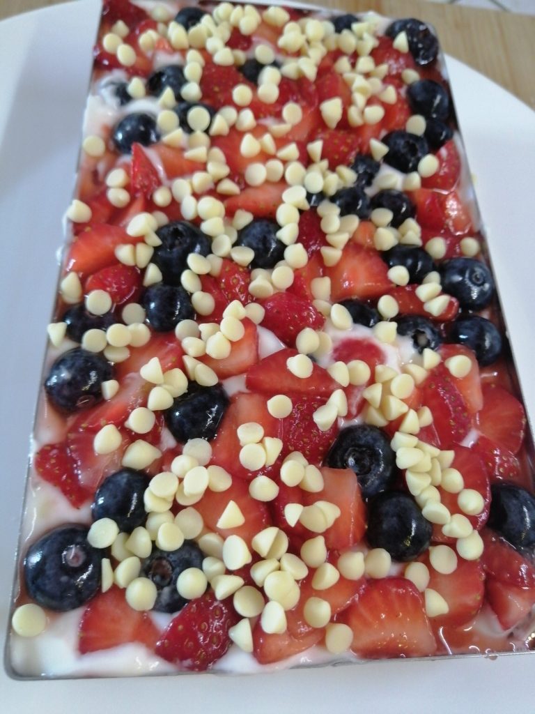 Der erfrischende Joghurt- und Obstkuchen ist bereit, genossen zu werden.