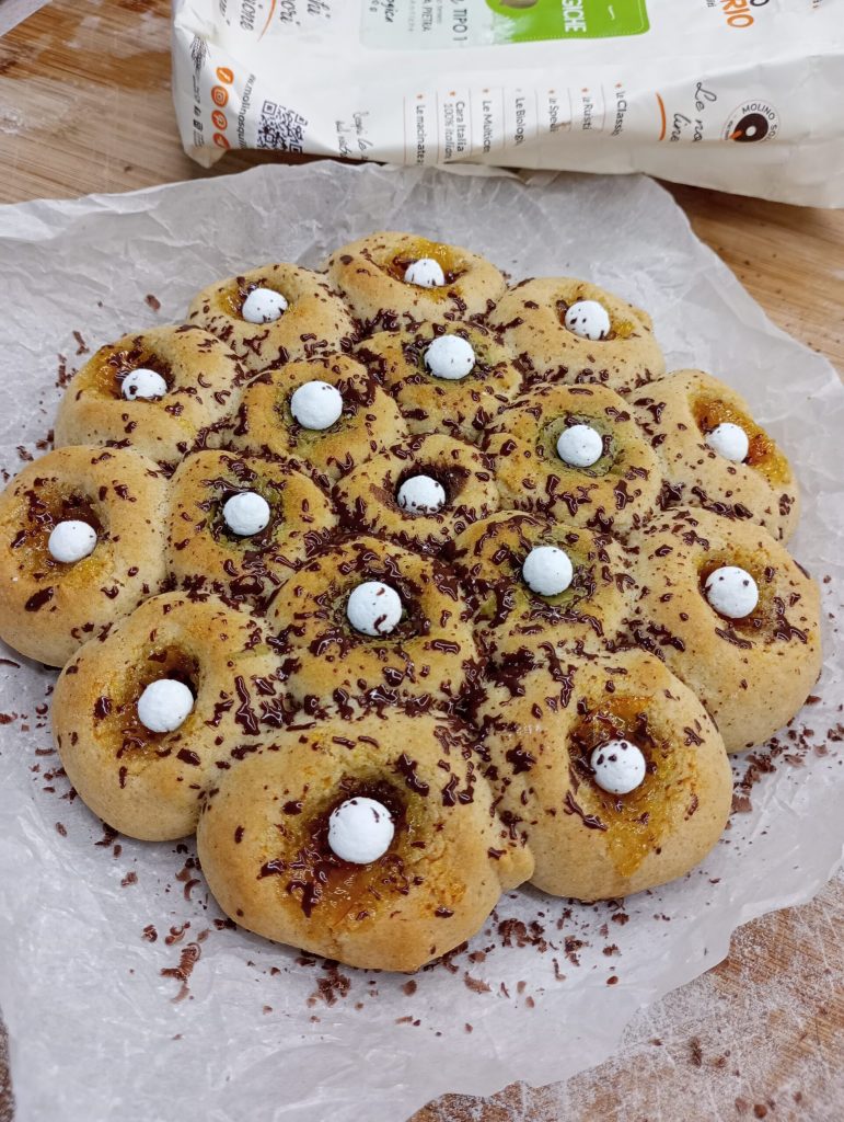 Mit diesen Mengen erhält man etwa 18 Kugeln, die in eine Form von 18-20 cm gegeben oder einfach auf Backpapier gelegt werden.