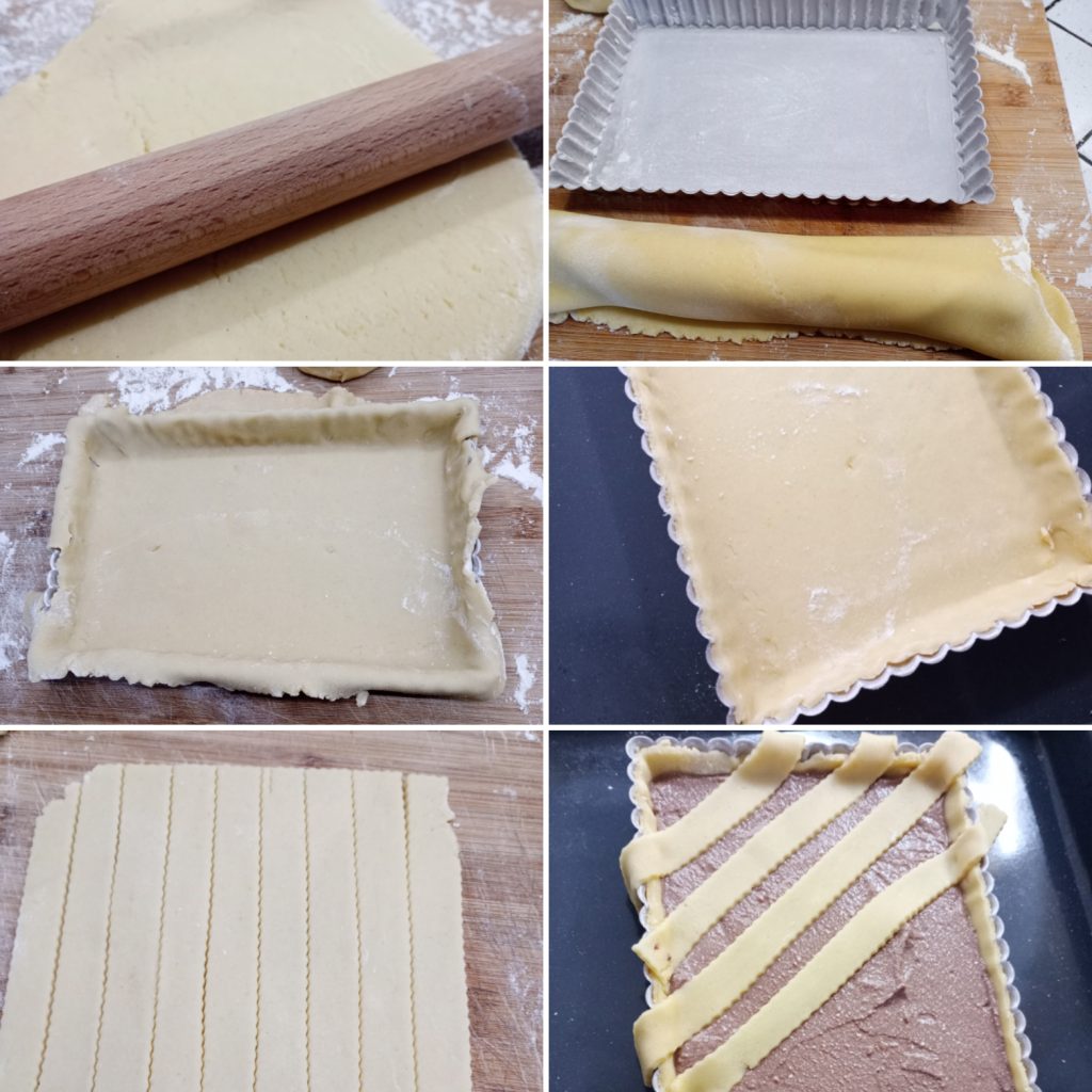 Ein Drittel des Mürbeteigs abnehmen und beiseitelegen, um später die Streifen für die Oberseite zu machen. Den restlichen Teig ausrollen und in eine eingefettete und bemehlte Form legen, die Ränder mit einem Messer gut abschneiden.
