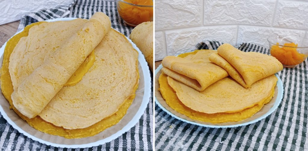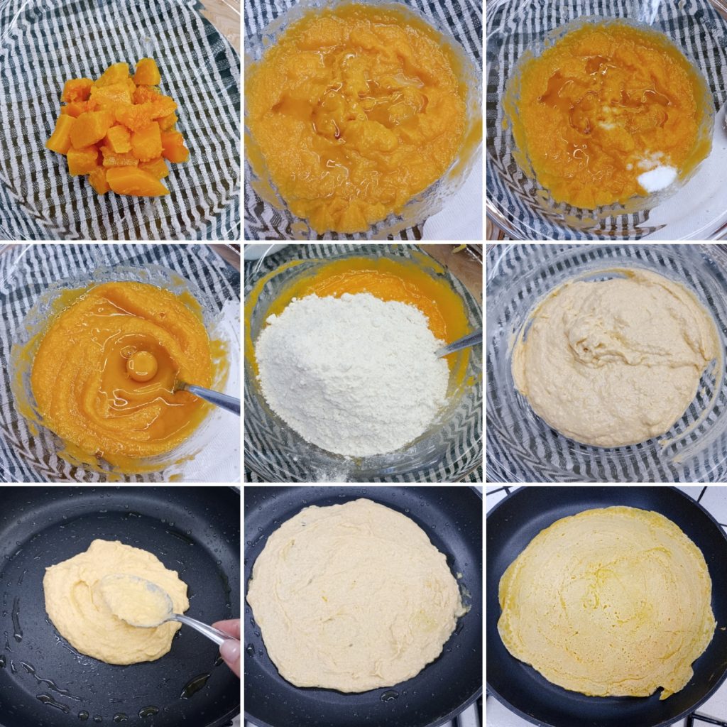Schritte zur Zubereitung der Kürbis-Crêpes.