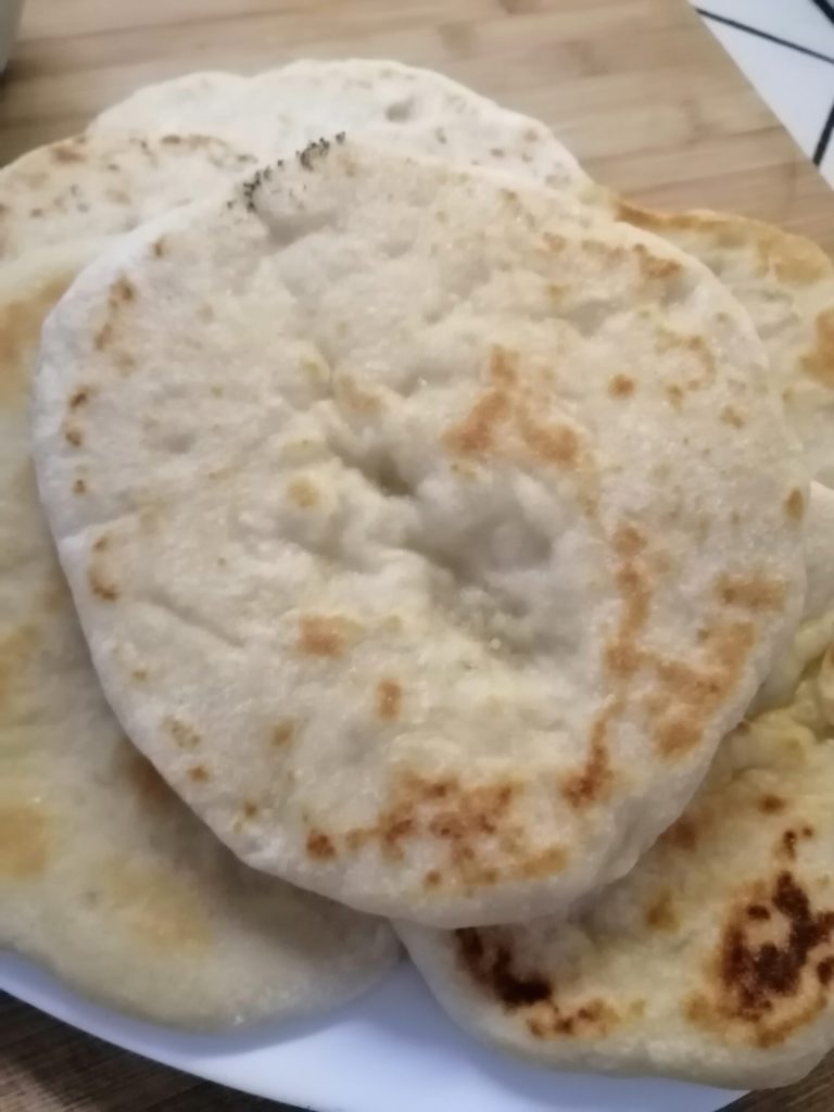 Die Pita ist eine Art von flachem rundem Brot, in diesem Fall in der Pfanne gebacken, auf Weizenmehlbasis. Es ist ein traditionelles Lebensmittel der Küchen des Nahen Ostens und des Mittelmeerraums, von Nordafrika bis Afghanistan.