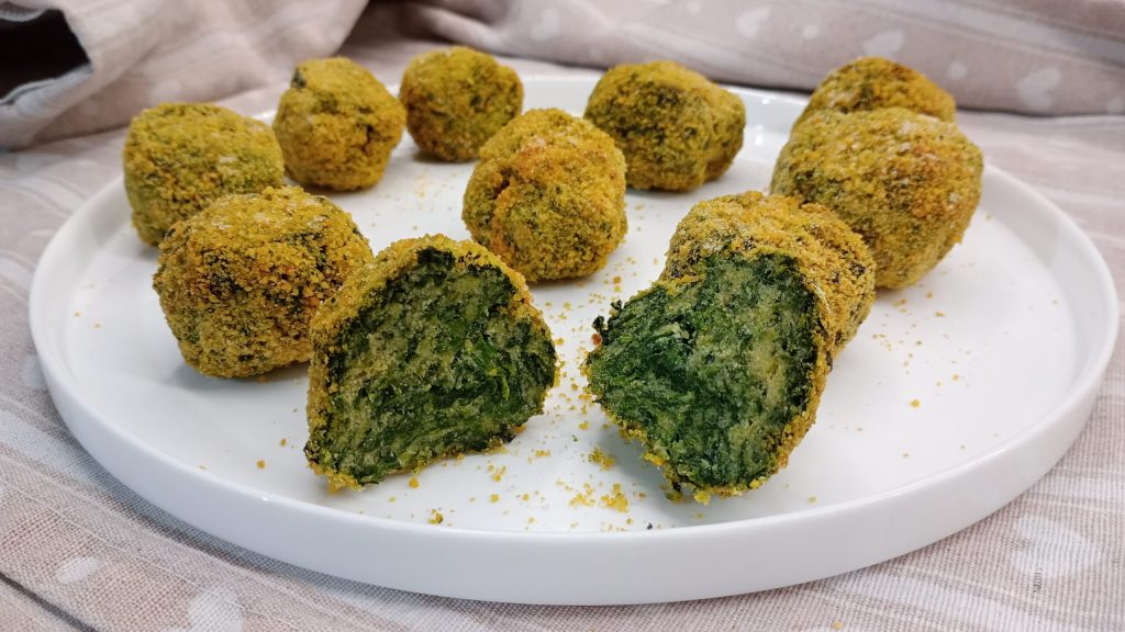 In einer Schüssel die zuvor in der Pfanne gegarten oder gekochten Spinat (gut ausgedrückt!) bearbeiten. Grob mit einer Schere zerkleinern, dann den Ricotta, das Ei, das Paniermehl und die gewünschten Gewürze hinzufügen. Alles gut vermischen und kleine Bällchen formen. Jedes Klößchen zuerst in das geschlagene Ei und dann in das Paniermehl tauchen, um eine perfekte Kruste zu erhalten.