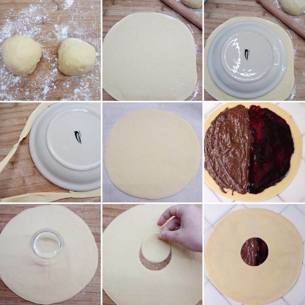 Den Teig in zwei Hälften teilen und auf einer leicht bemehlten Fläche oder Backpapier ausrollen. Mit Hilfe eines Tellers einen Kreis formen und mit einem Messer ausschneiden. Den entstandenen Kreis auf ein Backpapier legen, nach Wunsch füllen, den anderen Teig ausrollen und den Kreis formen, ein Glas in die Mitte stellen und ein Loch schneiden, den Mürbeteig über die Füllung legen und die Ränder gut verschließen.