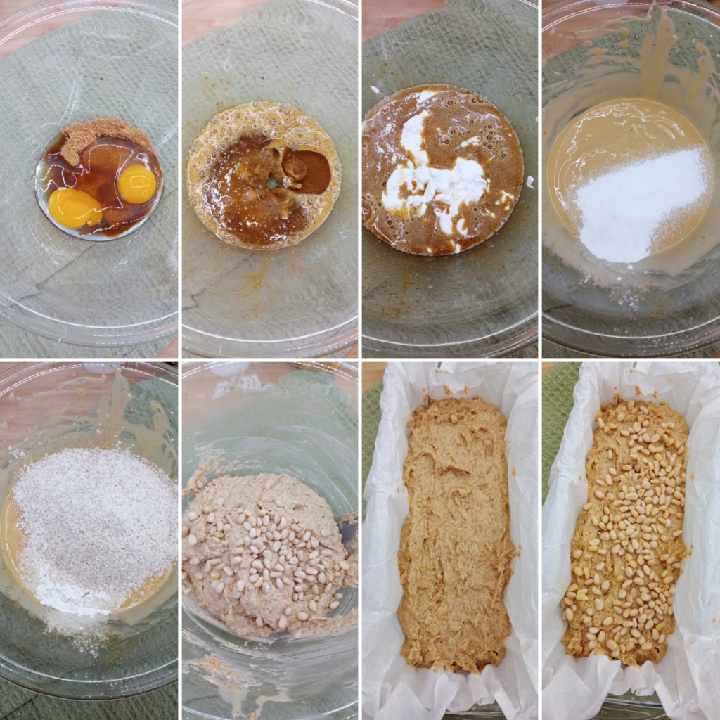 Den Teig in die Form gießen und gut ausgleichen, die restlichen Pinienkerne auf der Oberfläche verteilen.Bei 180° Umluftofen vorgeheizt für 40 Minuten backen.