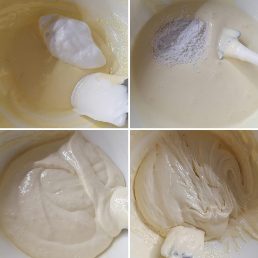 Nun beginnen, die steif geschlagenen Eiweiße sehr vorsichtig mit einem Spatel unter die Eier- und Zuckermischung zu heben, auch das zuvor gesiebte Mehl in mehreren Schritten einarbeiten und schließlich das gesiebte Backpulver hinzufügen.