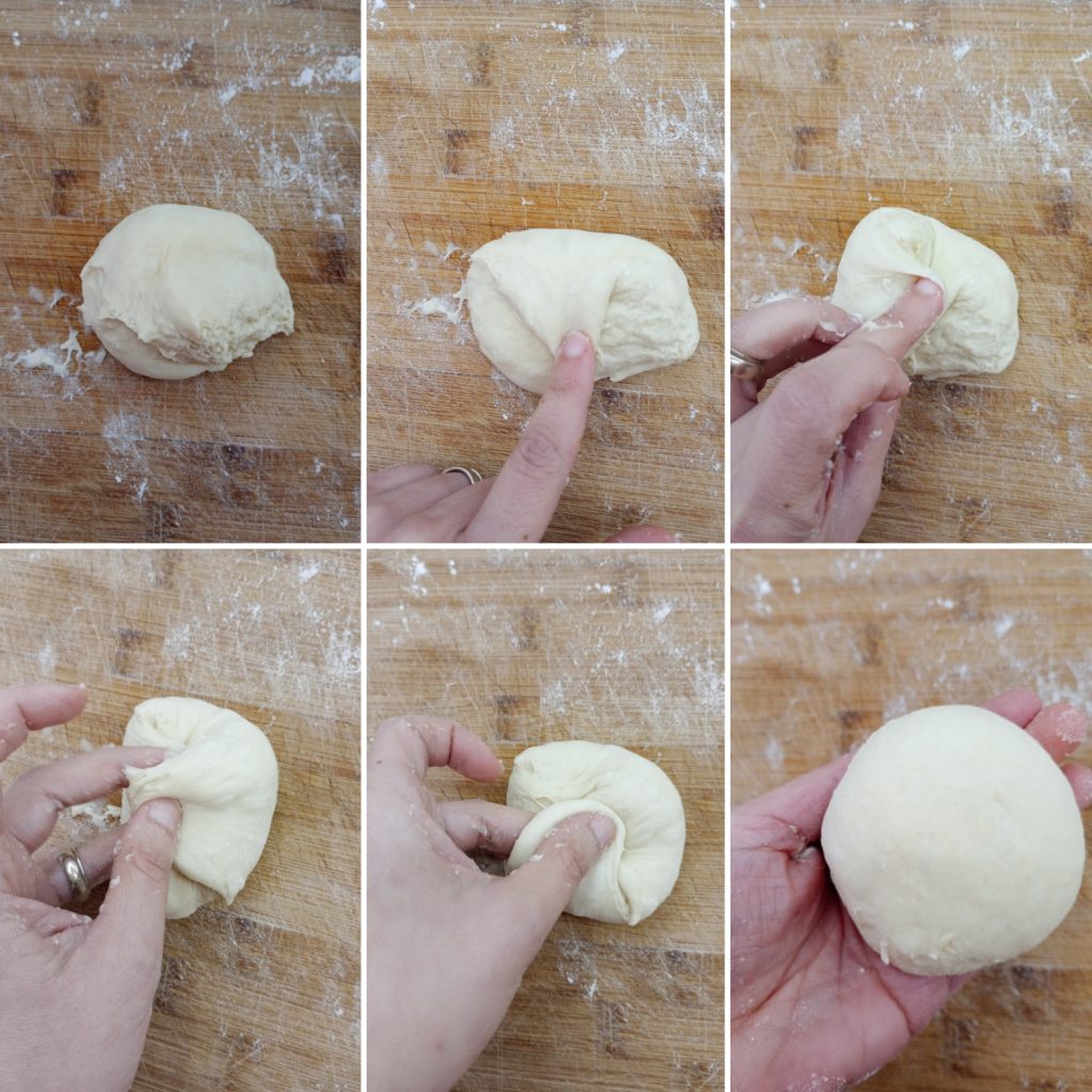 Das Teigstück nehmen und von den Rändern zur Mitte hin falten, bis eine Runde Form entsteht, und auf ein mit Backpapier ausgelegtes Blech legen.