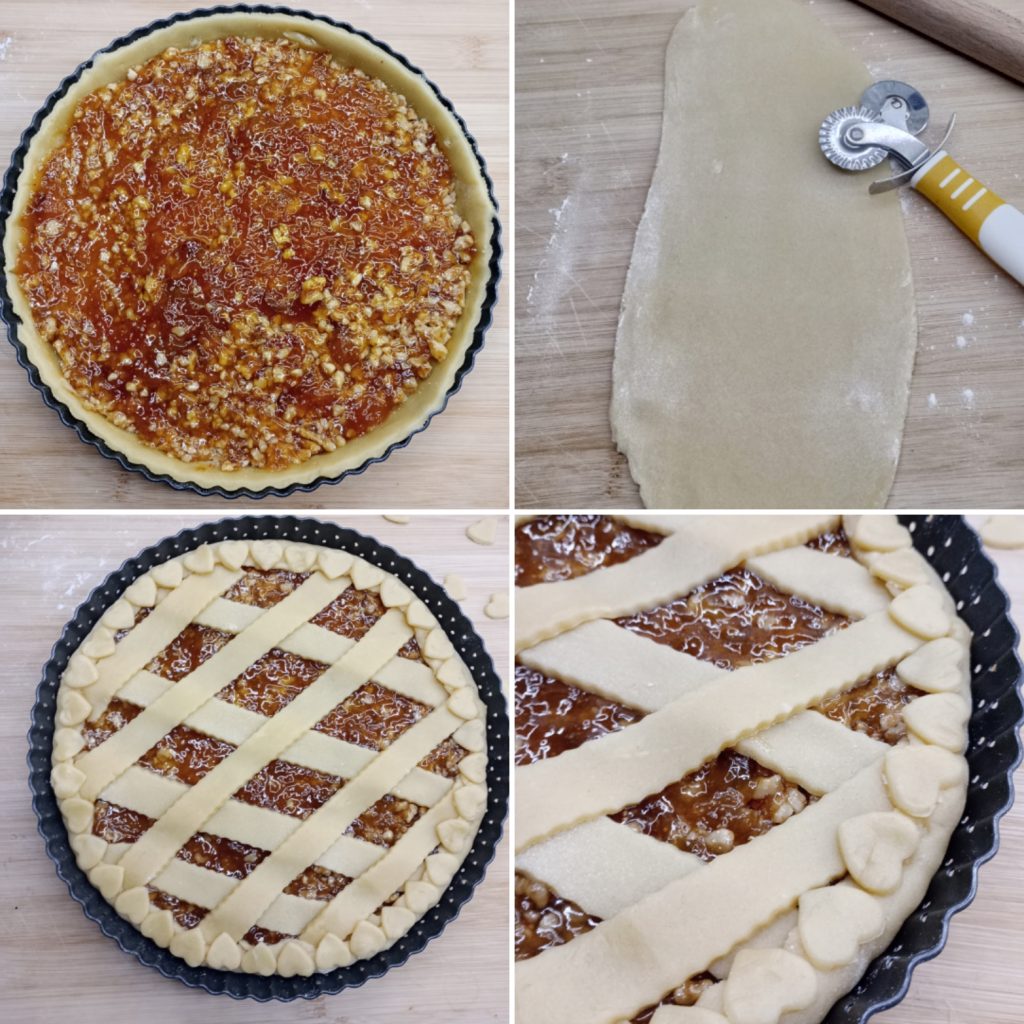 Mit dem restlichen Teig Streifen herstellen, die Ränder herunterdrücken und mit dem restlichen Teig habe ich kleine Herzen gemacht, die ich ringsherum platziert habe.