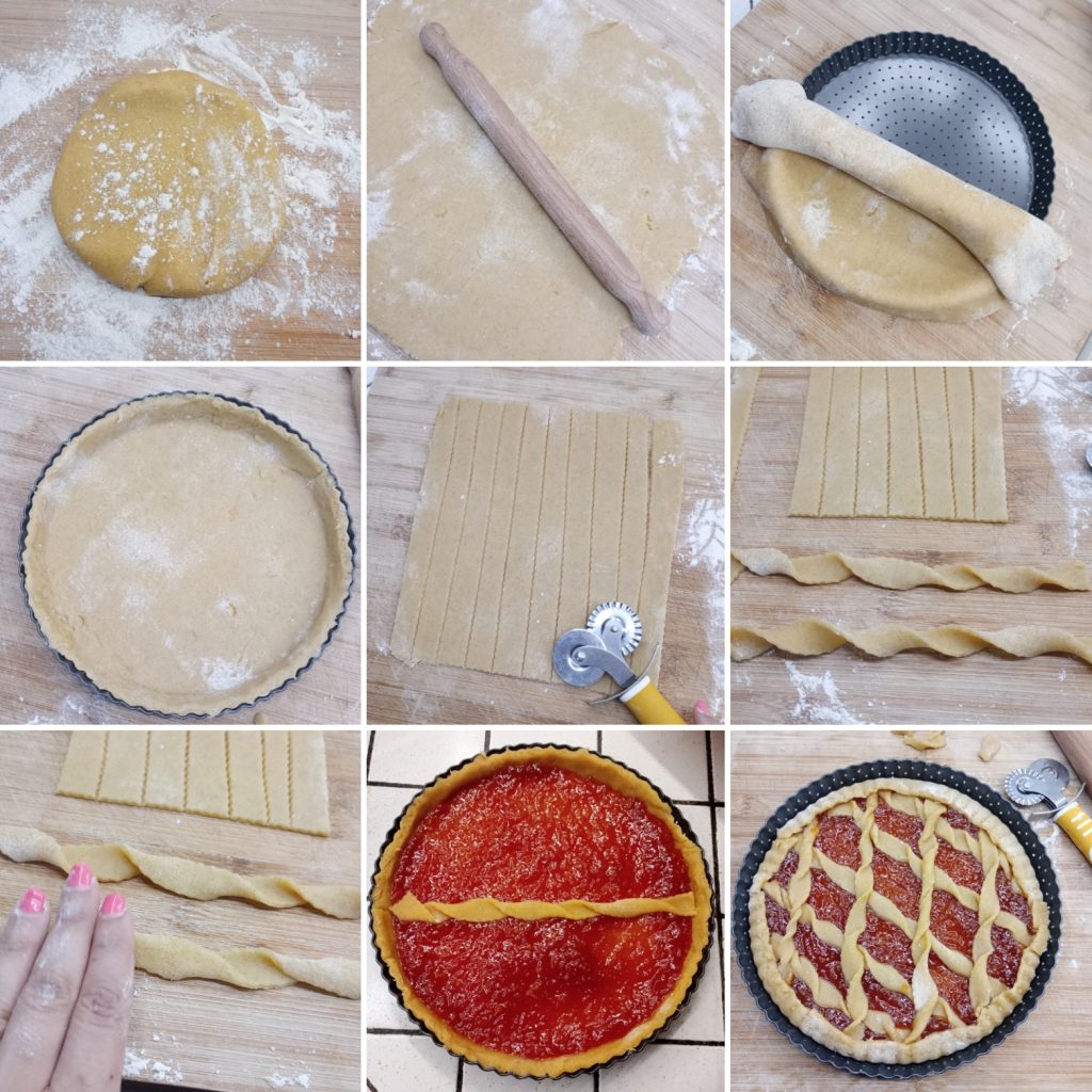 Die Marmelade einfüllen und mit dem restlichen Teig Streifen formen. Ich habe die Streifen gedreht, sie leicht gedrückt und dann daraufgelegt. Die Ränder der Torte nach innen biegen.