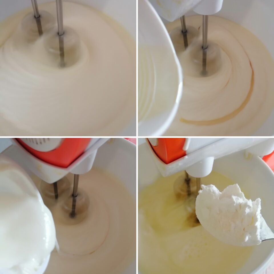 so weiter bis zum Ende der Zutaten, wenn alle Zutaten hinzugefügt sind, den Rührbesen noch zwei Minuten arbeiten lassen
