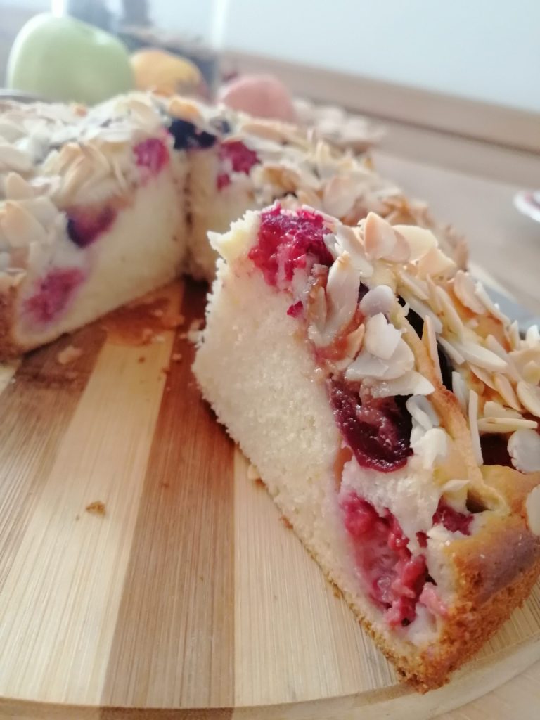 Der Vanillekuchen hat einen fantastischen Geschmack und ist sehr weich, das Obst und die Mandeln machen ihn perfekt.