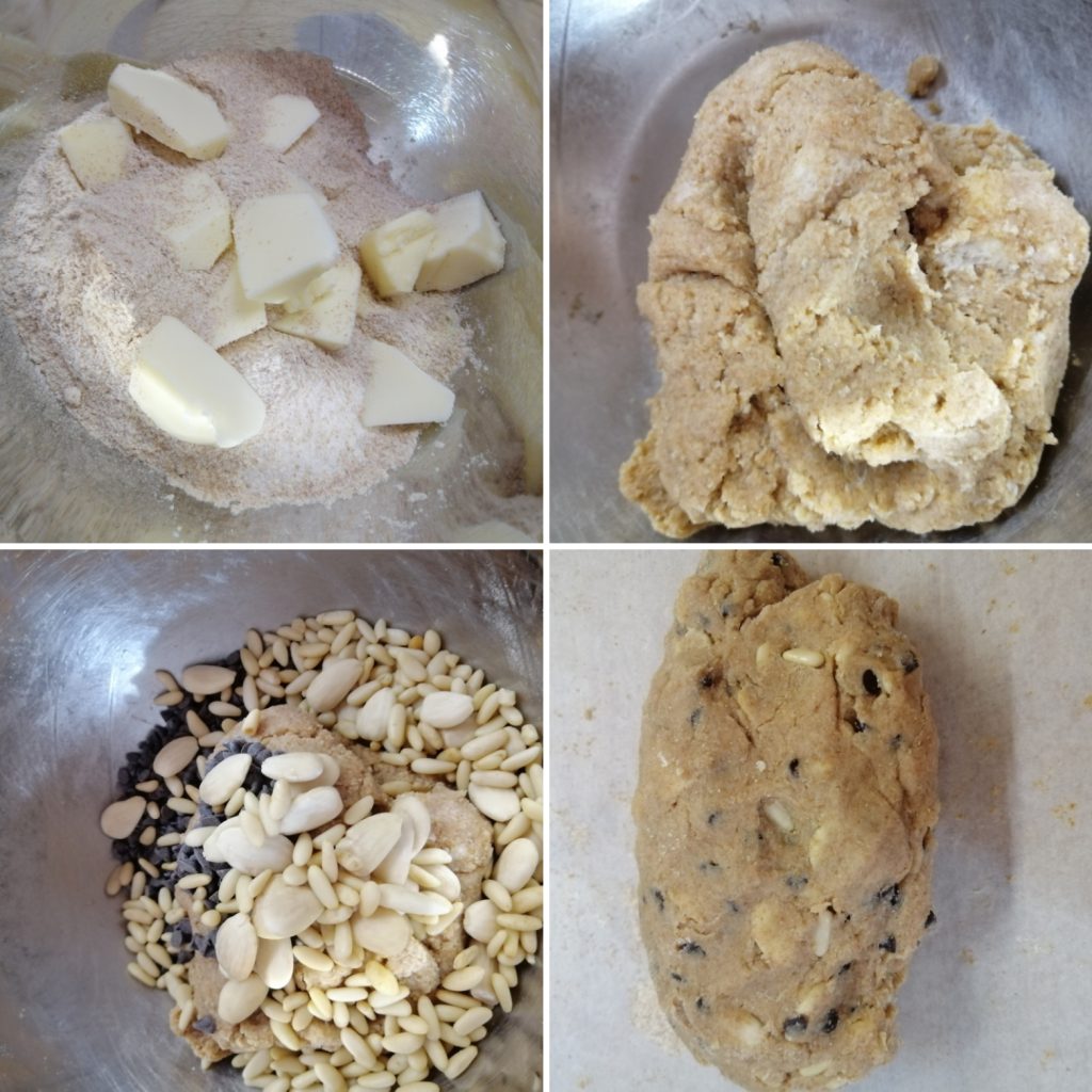 In eine Schüssel die Mehle und den Zucker geben und mit einem Löffel vermischen, die Butter hinzufügen und verkneten.