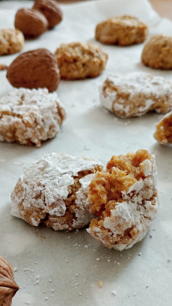 Backen Sie die Kekse bei 180 Grad im vorgeheizten statischen Ofen für 12 Minuten, nicht länger. Lassen Sie die Walnusskekse vollständig abkühlen und genießen Sie sie dann mit großer Zufriedenheit. Die Kekse sind direkt nach dem Backen sehr weich, das ist normal, nach ein paar Minuten härten sie aus.