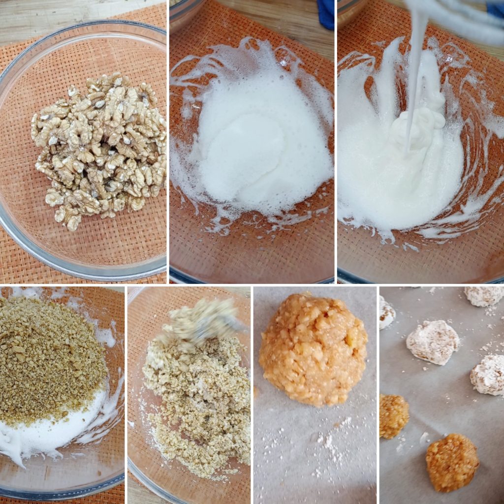 Zuerst hacken wir die Walnüsse grob in einem Mixer. In einer Schüssel schlagen wir mit einem Schneebesen das Eiweiß für ein paar Minuten auf und fügen den Zucker hinzu. Das Gemisch gut verrühren, bis es homogen ist.