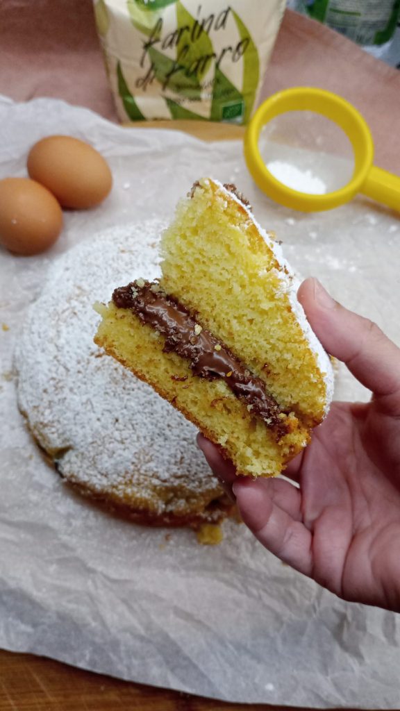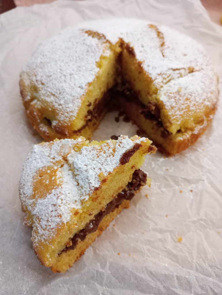 Ich habe den Kuchen mit Haselnusscreme verfeinert, einfach den Kuchen vollständig abkühlen lassen, in der Mitte durchschneiden und füllen.